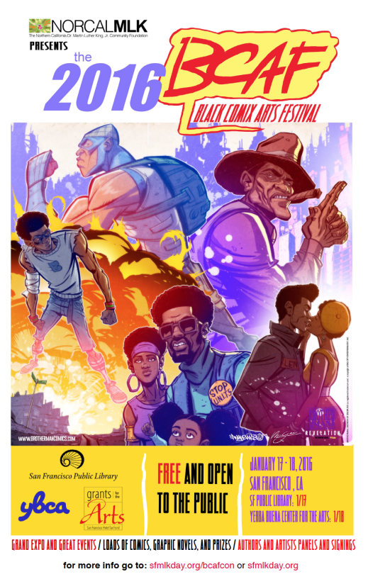 Mark your calendars! The 2016 BLACK COMIX ARTS FESTIVAL is at hand! More info here (subject to change and expansion): http://sfmlkday.org/bcafcon/ Want to vend?: http://sfmlkday.org/BCAF2016-vendorapp.pdf. Main image by two of our very special guests: DAWUD ANYABILE and BRIAN McGEE! of BROTHERMAN: REVELATION (http://www.brothermancomics.com/) the upcoming graphic novel from BROTHERMAN COMICS by GUY SIMS, DAWUD ANYABWILE, and BRIAN McGEE. We will jump things off at the San Francisco Public Library on the 17th and the main grand expo will be at the Yerba Buena Center for the Arts in Downtown SAN FRAN on the 18th MLK DAY!