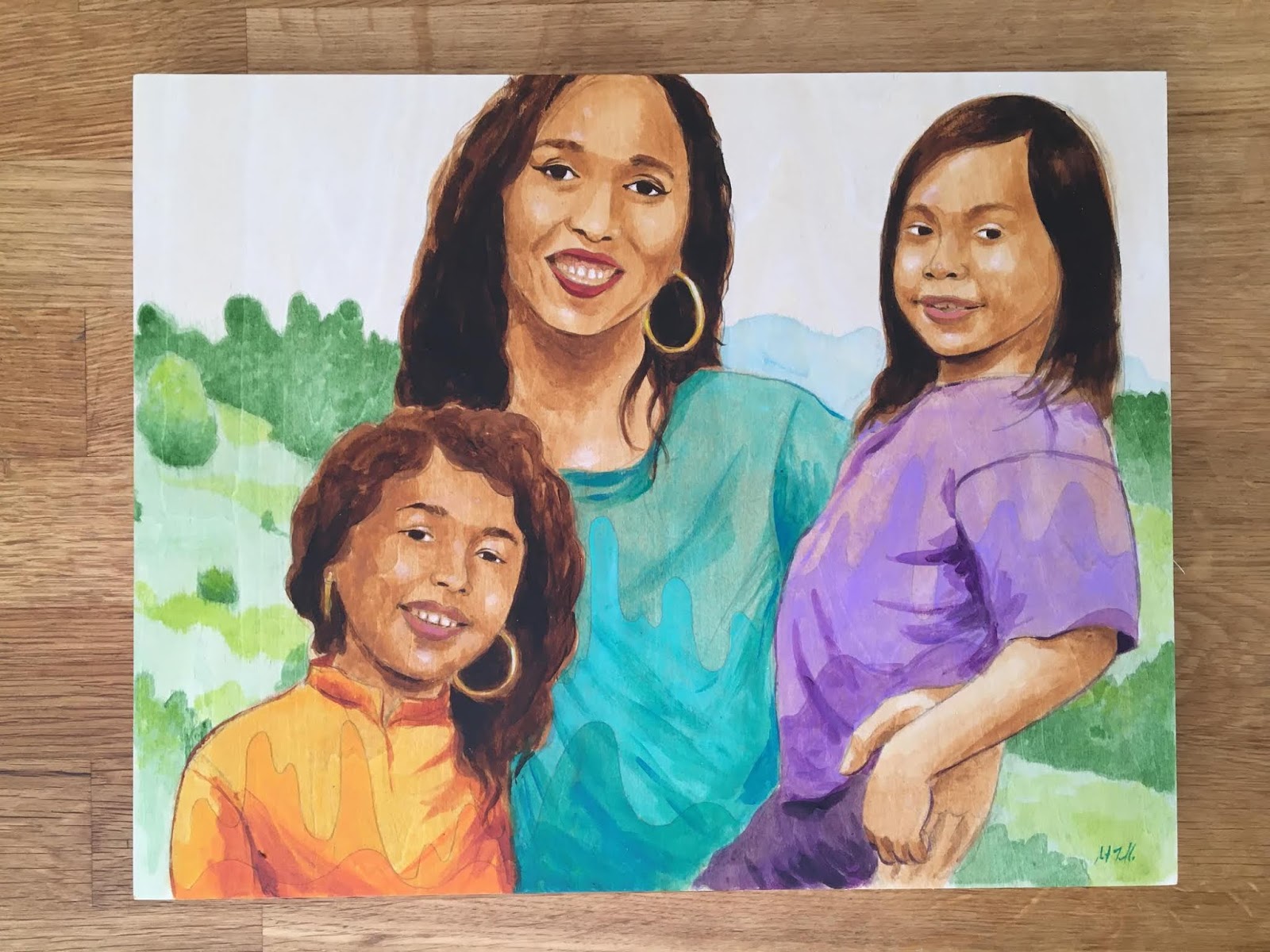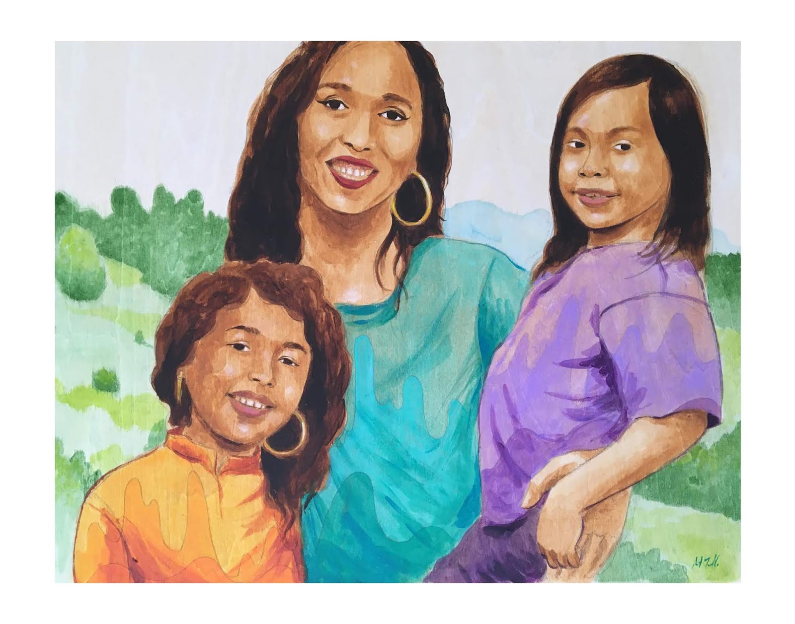 Just did a new family portrait of my good friend Cinthya and her babies who are not so little anymore. The family loves nature and I decided to combine that with their favorite colors. Several years ago I painted her oldest child Tlanextli. Check out the painting process below.