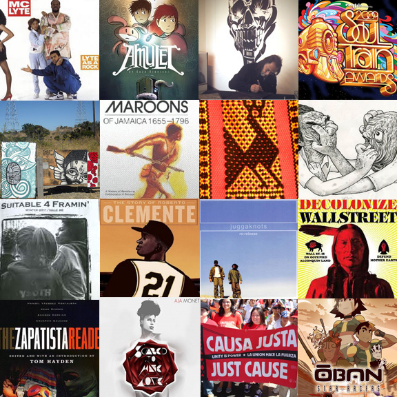 From top left to right:Mc Lyte’s 1st LP-Lyte as a rock (it’d been awhile, needed to hear it again), Amulet-Incredible graphic novel im reading w/ my kid, we’re on #3! Chaz Bojorquez-master calligrapher, Soul Train 09 ads-caught this at Atlantic st, Black Diamond Shining crew (Dead Eyes, Ras Terms, and Ash Rose n this shot), Maroons of Jamaica by Mavis Cambell, Textiles by Colectivo Raahuna-dope styles, Illustration by zine maker Travis Fudge, Suitable 4 Framin’ graffiti zine-homie Nisha is in this along w/Spie, “21 Story of Roberto Clemente” by Wilfred Santiago-incredible story/book/art, Juggaknots 1st LP-Clear Blue Skies!, Decolonize Wall Street-Cuz its a great necessary statement, The Zapatista Reader edited by Tom Hayden feat hella writers, Aja Monet-amazing poet who got lines 4 days, Just Cause/ Causa Justa becuse they’ve taken on some great work, Oban-Star Racers-just watched some of this w/ my kid.Cool animation collab btwn French and Japanese animators.