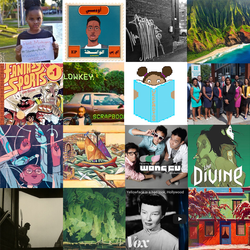 1. Solidarity between Black and Indigenous folks around water rights 2. Alwasta by Oddisee- a dope EP 3. Graffiti hand styles by Canser 4. Kauai’s Nopali Coast 5. Fantasy Sports 1 by Sam Bosma 6. Lowkey- an ill producer from LA’s beat scene 7. We Read Too-an app for finding diverse books 8. Atlanta’s citizen’s trust bank-a Black owned bank, a symbol of financial power 9. Illustration of Richie Pope 10. Mary Grandpre – illustrator of Harry Potter and many other books 11. Wong Fu-An Asian American film production company 12. The Divine-a graphic novel illustrated by Tomer Hanuka 13. Photo by Roy DeCarava 14. Scenic painting by AJ Casson 15. An educational report by Vox on white washing of Asians in US films 16. Scenic painting by Adam Noonan.
