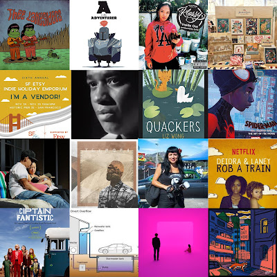 From top to bottom, left to right: 1. Thee Lakesiders-oldies LA Soul group, 2.The Etherington Brothers-great storytellers 3. Klassy-LA Rapper/Mama 4. Andrea Smith-illustrator w/ amazing vendor set up 5. SF Etsy Holiday Emporium-inspiring to experience indy power 6. San Nukas-A portrait of Moses Powell 7. Quackers-Liz Wong Picture book 8. Spider Verse-dope film 9. My daughter’s arrival this year has been amazing and awe inspiring 10. Teymori-house producer/musician 11. Stephanie Bueno-Lowrider/Photographer 12. Diedra & Laney-great film 13. Captain Fantastic-incredible film 14. Greywater systems for homes 15. Art of James Turell 16. We Out Here- British Jazz LP