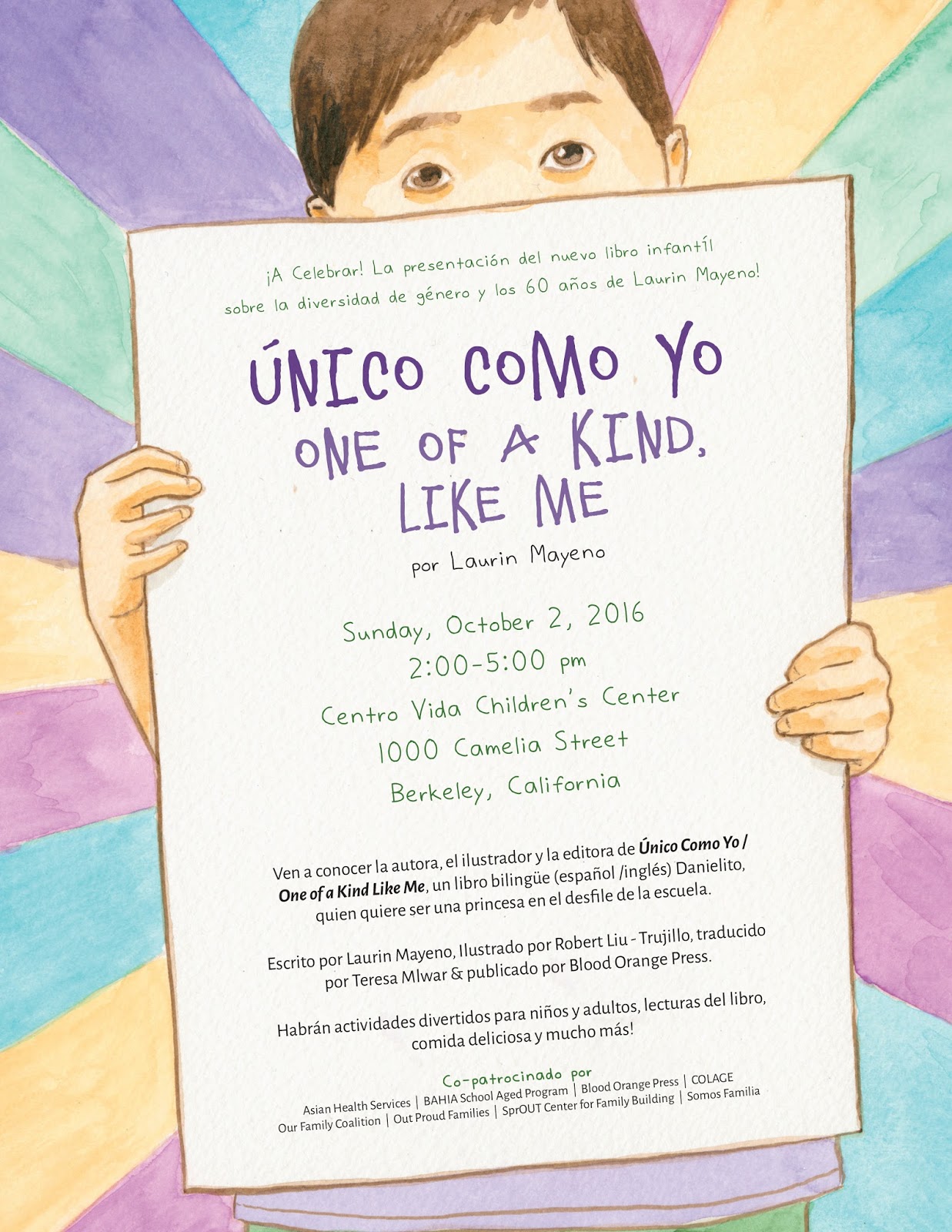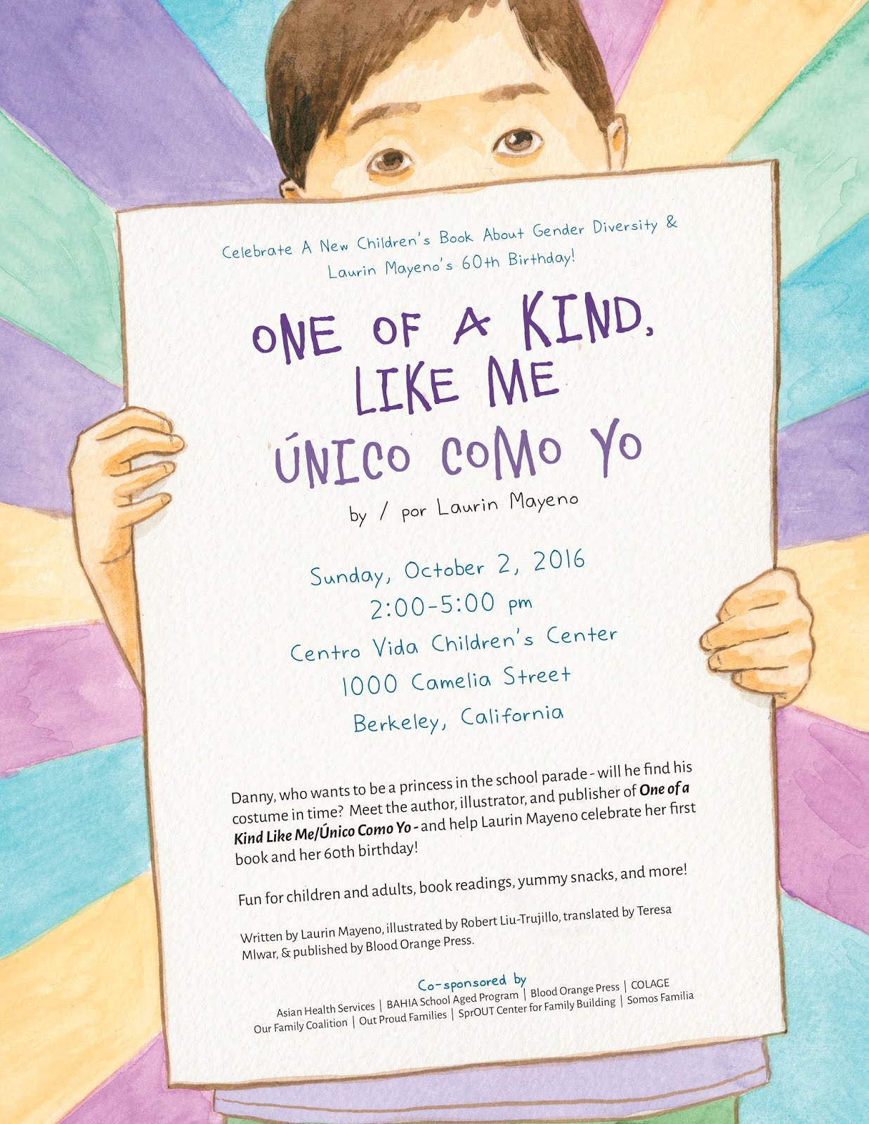 Ok, si eres es un padre, maestr@, bibliotecario, un dueño de librería, un tío, una tía, o un caregiver por favor llega a este acontecimiento de liberación de libro. Aquí usted tendrá noticias del autor de este libro sobre su historia y la creación del libro. Usted tendrá noticias de mí sobre mi proceso de crear las ilustraciones para ello, y usted tendrá noticias de nuestro editor Janine Macbeth de la Prensa de Blood Orange Press que hablará de la importancia de libros diversos. Este libro es bilingüe también, tan si usted piensa que usted conoce a alguien que podría usarlo en el español también, por favor venga consiguen una copia. En este acontecimiento también firmaremos libros y celebraremos el 60 cumpleaños de su escritor Laurin Mayeno.