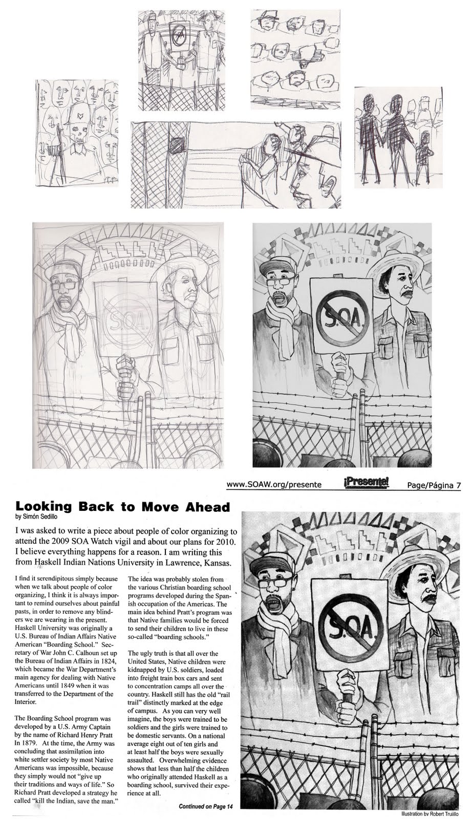 I came across Presente! in the Berkeley Public library about three or four months ago and immediately contacted them to be a contributing illustrator. I was handed a very honest, powerful, and inspiring piece written by Simon Sedillo. Below are sketches, the spread, and final illustration in color. Presente is working to inform people about the “School of Americas”, and they are actively campaigning to SHUT IT DOWN!. The School of Americas(now called “Western Hemisphere Institute for Security Cooperation”)has trained thousands of soldiers from Columbia, Guatemala, Chile, Nicaragua, El Salvador, and other countries in torture tactics to be used against their people. More specifically these tactics are used to weaken and destroy legitimate revolutions against United States backed Puppets. Kidnapping, torture, rape, and murder of anyone whether you are a known dissenter or a suspected activist is . In many countries in Latin America, thousands and thousands of people have been “disappeared” for daring to stand up against Imperialism in their countries. Simon wrote about the history of genocidal tactics used against people of color here in the US, and he relates it to why such institutions such as the SOA need to be shut down!To see some of the other artists who have contributed to the paper like Dignidad Rebelde, click here.