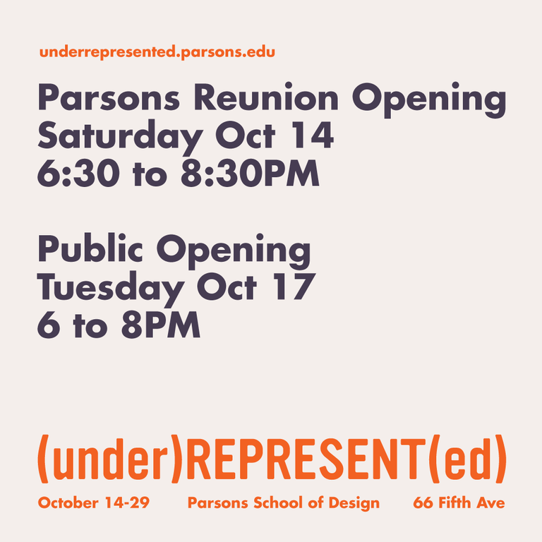under)REPRESENT(ed) is an exhibition that features Parsons School of Design alumni of color whose creative practices explore the lived experience of race and aim to dismantle systems of racism. Initiated and organized by a collective of alumni of color, this exhibition features a range of disciplines which simultaneously address and resist the systemic exclusion that prevails in educational and professional institutions and practices.