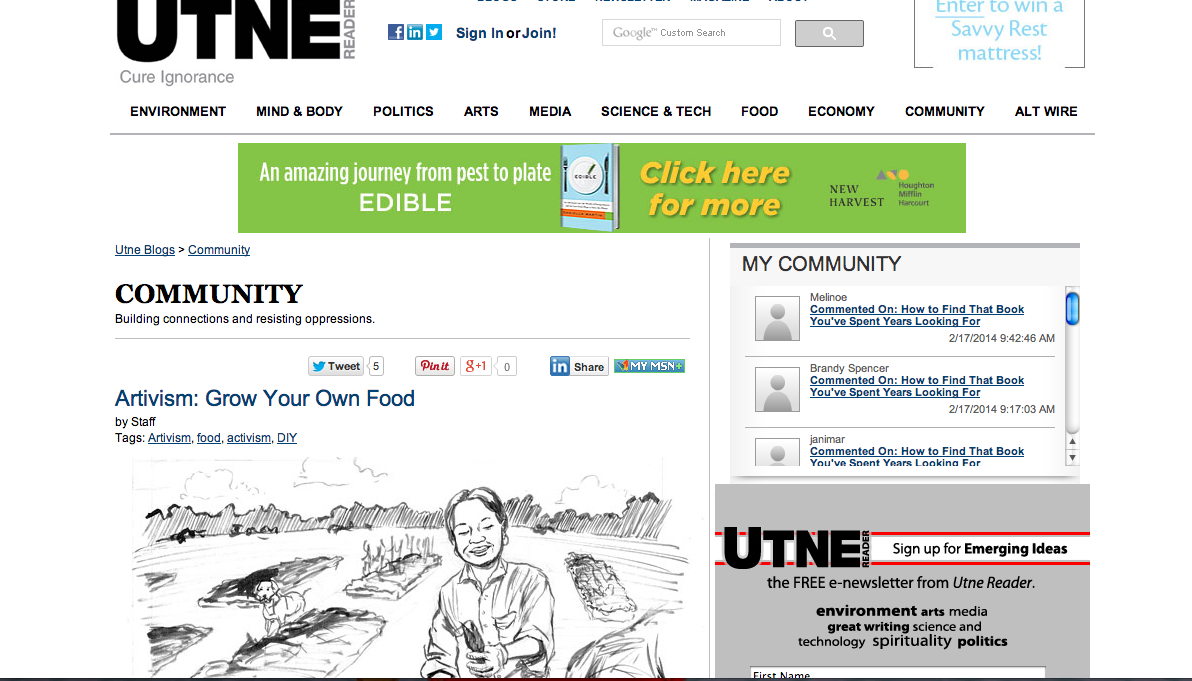 UTNE is a forward thinking news source/magazine out of the mid west. I have been checking them out for awhile; intrigued by the covers first then drawn to read up on topics such as farming, protest, politics, good music, environment, and more. I’m starting to work with them and art director Suzanne Lindgren on a series of short op ed type pieces about what people are doing to change the world. Illustration accompanying each one will be coming more regularly I hope and hopefully more collaboration with UTNE. Please go read the article for yourself HERE and check out their site.